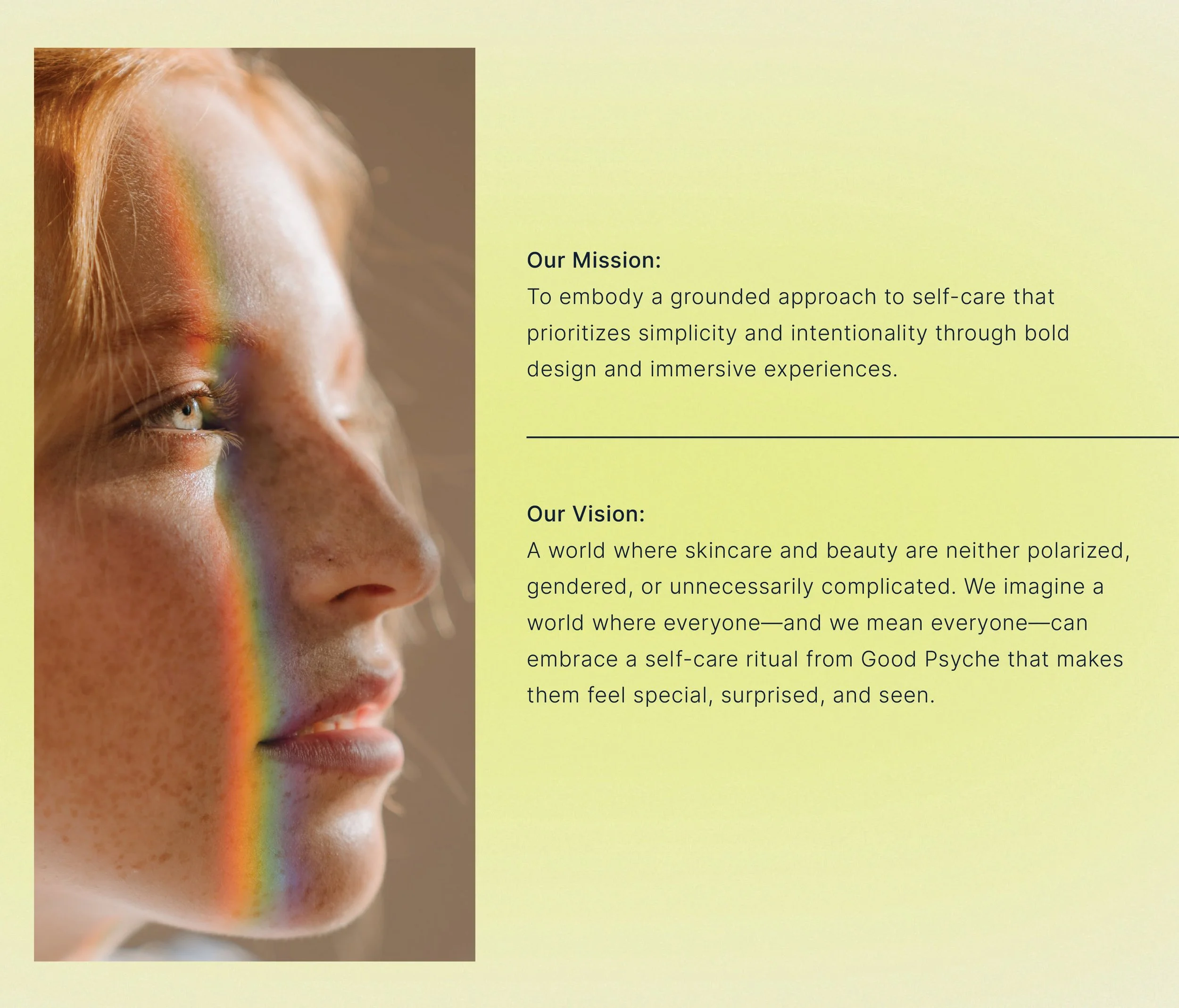 Enter: Good Psyche, an intersectional approach to skincare, beauty, and wellness that rejects boundaries and reinvents the traditional self-care experience. We pair opinionated design with curated, immersive, and intentional experiences. Our line of products—from dynamic duos that work internally and externally to other innovative approaches—embrace and encourage both presence and ritual for our customers.